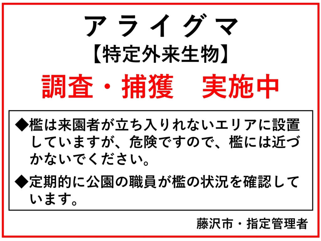 アライグマ(特定外来生物)の調査・捕獲を実施しています 2026.03.04 公園では3月から、アライグマ(特定外来生物)の調査・捕獲を実施しています。 檻はお客様が立ち入りできないエリアに設置していますが、危険ですので檻には近づかないようお願いいたします。 定期的に公園の職員が檻の状況を確認しています。 KODAK Digital Still Camera