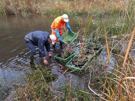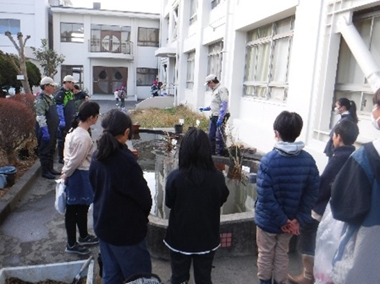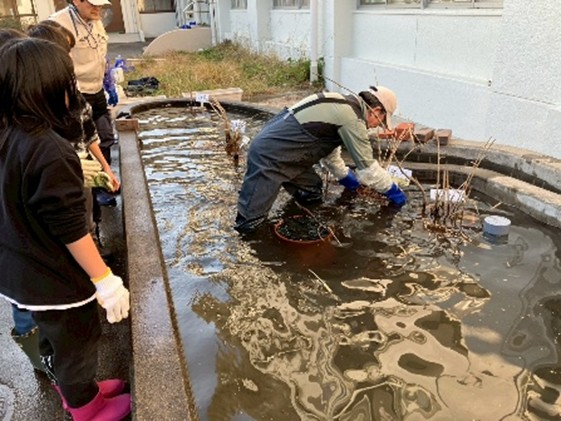 大越小学校様(市内善行)の生物保護委員会のビオトープ整備の取り組みの一環として、公園内の水辺の植物(「オモダカ」・「サンカクイ」・「ヨシ」・「ヒメガマ」・「コガマ」など8種類)を提供させていただきました。1月14日(水)には、市みどり保全課のご指導をいただきながら、植物を生物保護委員会の皆さんと一緒に植栽しました!